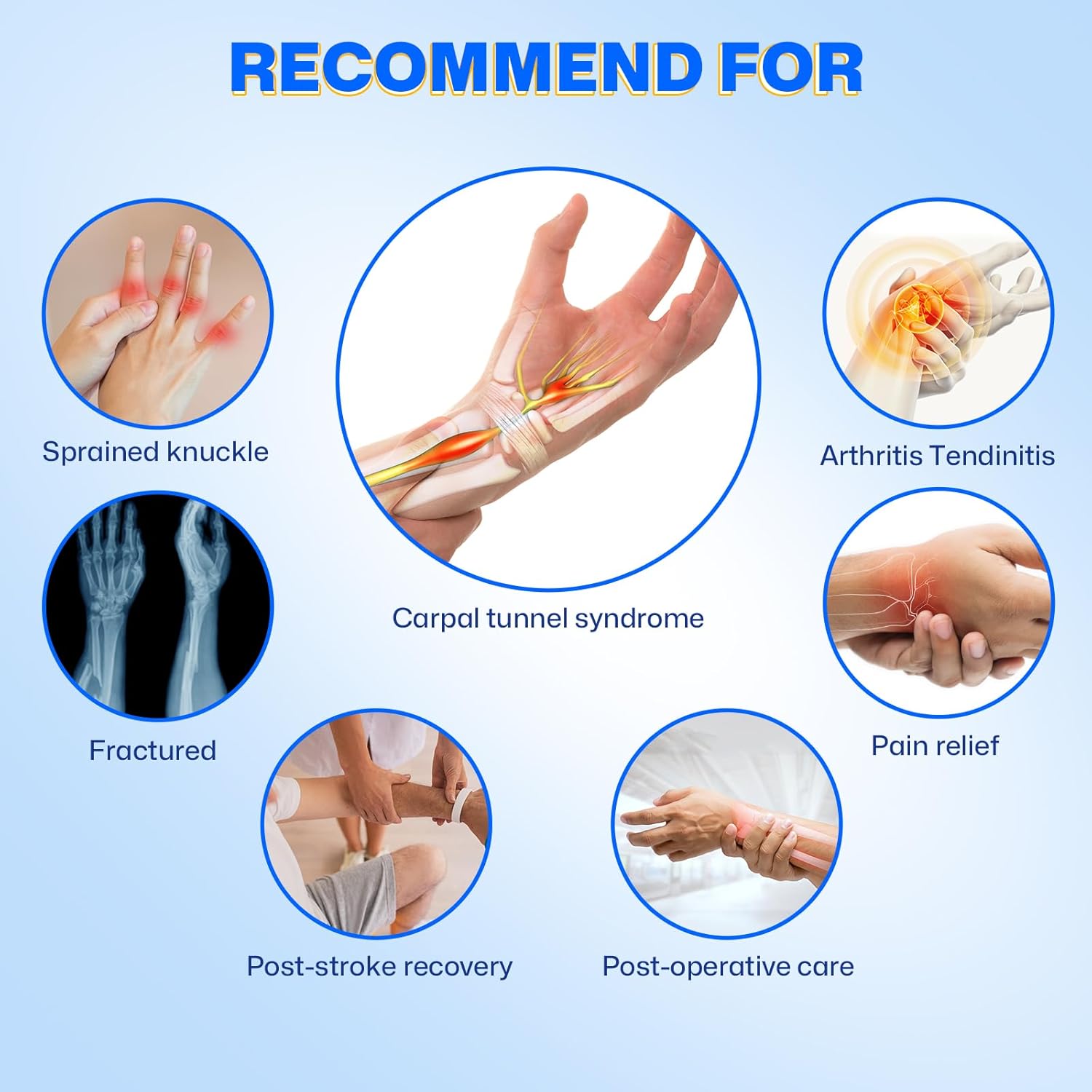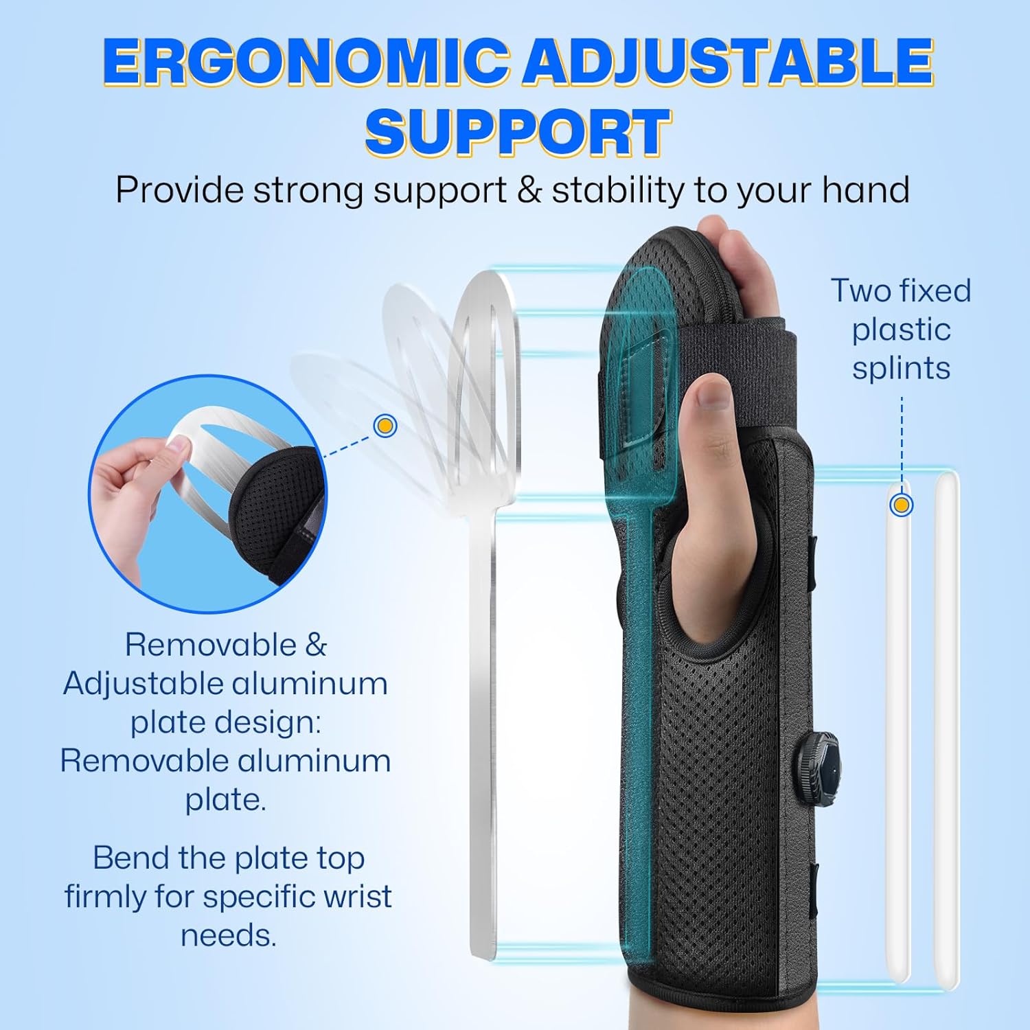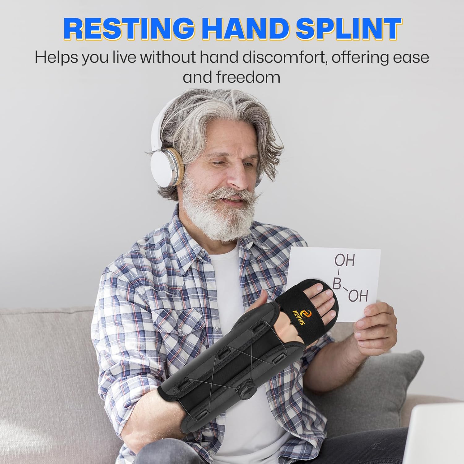 Package Dimensions : 12.6 x 4.21 x 1.93 inches; 7.37 ounces Date First Available : April 8, 2025 Manufacturer : NEVVIS ASIN : B0F43VYF2V Country of Origin : China Unique Knob System – Our resting hand splint features a precision knob design for easy tightening with minimal effort. Gentle pressure from the adjustable wire ensures a secure, comfortable fit, ideal for seniors, weak wrists, or injury recovery Universal Fit for Both Hands – This hand and wrist brace fits either hand, offering versatile support. It stabilizes the entire hand area, including the wrist and fingers, preventing finger movement from hindering recovery. Promotes hand recovery Premium Materials – Crafted from breathable mesh and skin-friendly lining, this upgraded brace for carpal tunnel offers enhanced comfort and durability, ensuring maximum airflow and gentle support. It’s ideal for extended wear during rest or light tasks Detachable Aluminum Plate – The hand wrist brace features a lightweight, detachable aluminum plate for support. Bend the plate top firmly for specific wrist needs. Ensures flexibility for daily activities. Ergonomic design keeps fingers and wrists relaxed Enhanced Recovery & Protection – Specifically designed to protect injured bones, tendons, and ligaments, this hand & wrist supports & splints promotes faster restoration of hand comfort. Ideal for nighttime use or daytime support to address discomfort from overuse or strain