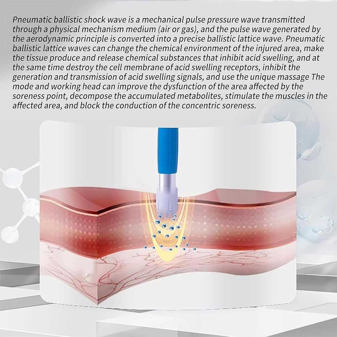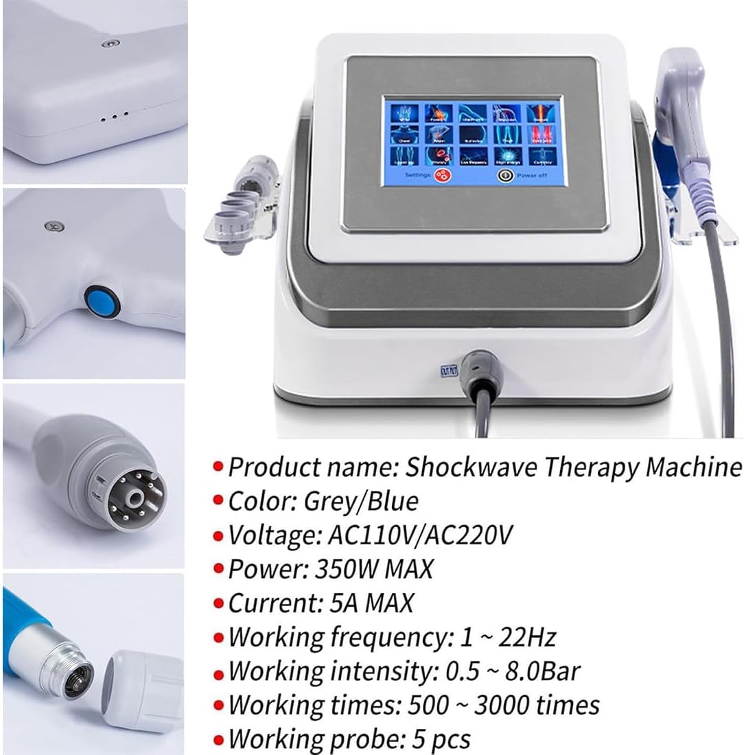 Features: 1.Effectively alleviates discomfort in joints without the need for surgery or anesthesia. 2.Enjoy a comfortable and speedy recovery process. 3.Widely applicable to different soft tissue treatments. 4.Improve microcirculation and metabolism. 5.Comes with multiple probes to address specific treatment needs. 6.Offers support for individuals experiencing ED. Specifications: Name: Shockwave machine Color:Grey/Blue Screen: HD display Voltage: AC110V/AC220V Frequency: 50Hz/60Hz Power: 350W MAX Current: 5A MAX Working intensity: 0.5~8.0Bar Working frequency: 1~22Hz Working times: 500~3000 times Massage probes: 5 pcs Supported languages: Chinese/English Net weight: 13.5 Kg Packing list: 1 * Shockwave therapy machine 5 * Massage Head Prohibited To Use Crowd: 1.Heart disease,high blood pressure patients,pregnant women 2.Patients with acute inflammation,deep vein thrombosis,goiter,asthma,cancer,etc. 3.Blood vessel rupture,trauma,wound bleeding. 4.Artificial fillers in the body after plastic surgery. 5.People with metallic substances in their bodies. 6.Inflamed skin and swelling of the body. 7.People with a dysfunctional immune system. Date First Available : May 5, 2025 Manufacturer : DUANWUS ASIN : B0F7H3YQH2 Country of Origin : China Shockwave Therapy Device: This shockwave therapy device utilizes pneumatic principles to generate precise ballistic lattice waves,offering an effective and non-invasive solution for pain relief.Widely applied to different soft tissue treatments. Multi-Part Massage: Mainly for physical therapy treatment,sports injury and rehabitation,also can be used to slimming and remove cellulite.Not only for back massage,but also for neck,shoulder,waist,foot,leg,hand. Versatile Functionality: Featuring 5 interchangeable massage heads and 12 customizable modes,you can easily select the mode that corresponds to the level of discomfort in various body areas for targeted relief. Effective Pain Relief: This muscle therapy machine adopts humanized design,provides settings,is easy to operate,and ensures instant impact output. Relieve rheumatic joint pain,improve lumbar muscle strain and osteoporosis,very suitable for middle-aged and elderly care. Broad Applicability: Compact yet powerful,this device includes a user-friendly,high-resolution touchscreen,making it perfect for beauty salons,health rehabilitation centers,and personal use.