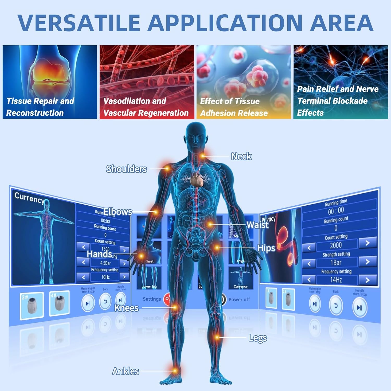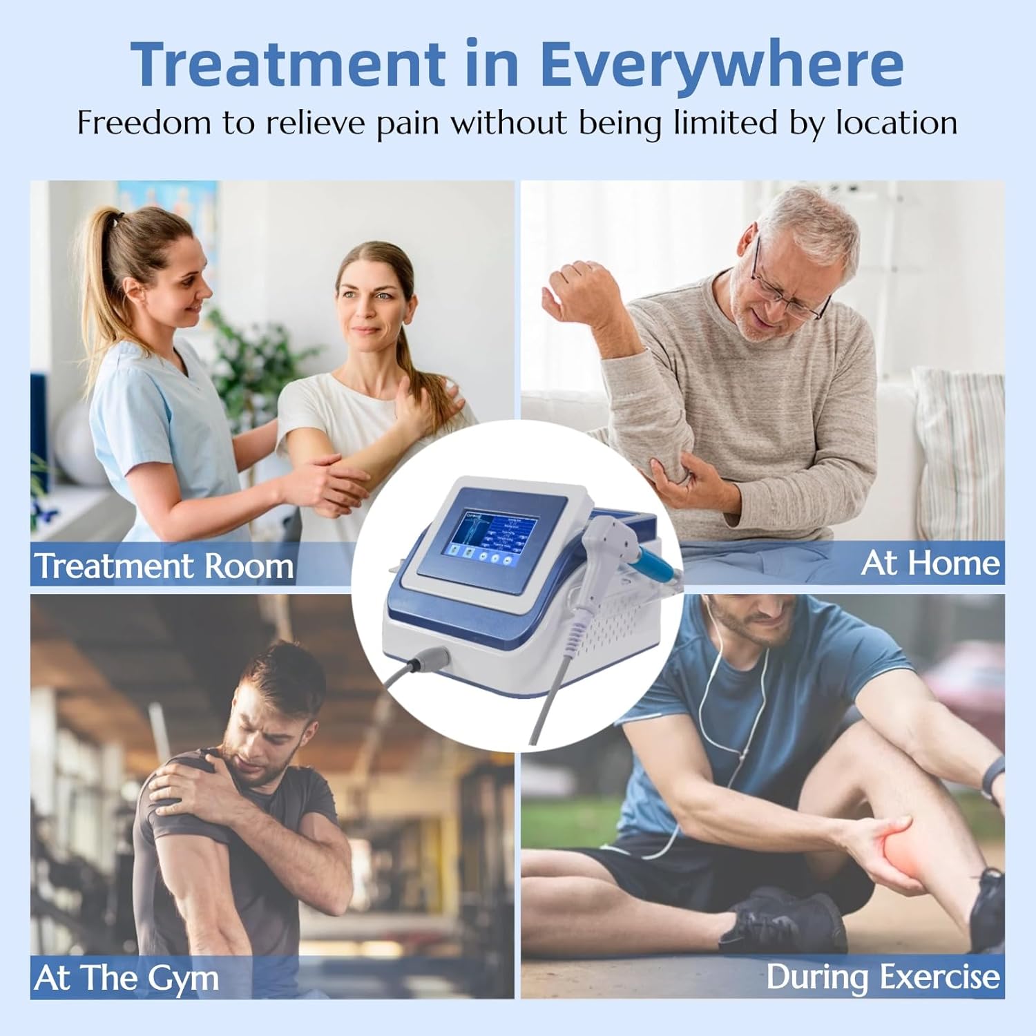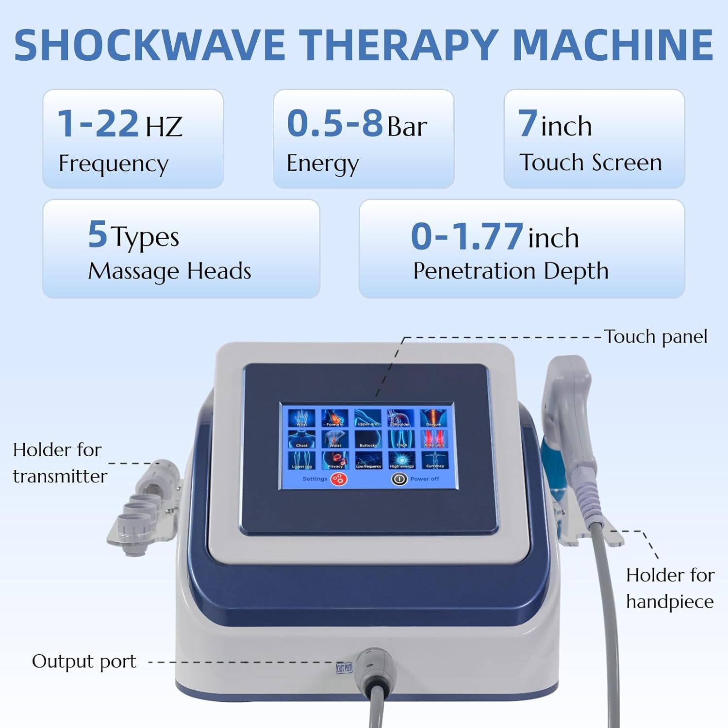 Product Dimensions : 12 x 17.7 x 14.2 inches Date First Available : May 7, 2025 Manufacturer : Wyoutonon ASIN : B0F7R8X4KV Country of Origin : China 【Professional Shockwave Therapy】The ESWT shockwave therapy machine uses high-frequency shockwave energy to generates high pressure to gather and act on the body, ensuring an efficient and stable output to stimulate tissue cell regeneration, improve blood circulation and relieve pain. This is widely used in physical therapy, sports rehabilitation, etc. 【Safe & Side-effect-free】This non-invasive therapy accelerates recovery, enhances mobility, and reduces pain without side effects. Ideal for improving blood circulation, alleviating chronic pain, and promoting tissue healing. Suitable for shoulders, elbows, wrists, back, thighs, knees, and feet,etc. 【Whole Body Care】Shockwave physical therapy device is equipped with 12 treatment modes and 5 treatment heads for different parts and needs. Whether you need deep tissue stimulation or targeted therapy for specific areas, our shockwave therapy device has the right attachment to meet various needs, designed for physiotherapists, home care and fitness enthusiasts. 【Intelligent Control 】Designed with a user-friendly 7-inch HD touchscreen, simply select the treatment area and adjust the parameter to begin professional-grade therapy. Our device offers pulse frequencies ranging from 1 to 22 Hz and pressure levels up to 8 bar, users can adjust pulse frequency, number of pulses and pressure level to enhance comfort and therapeutic results. Each treatment takes only 10 minutes, which is a safe, efficient and fast treatment method. 【Versatile Application】This shock wave therapy machine offers a wide range of applications, providing fast relief for joint and muscle pain, stimulating collagen formation. This non-surgical, non-invasive treatment is widely used in rehabilitation physical therapy, sports medicine and orthopedics. Whether used in specialized clinics, medical facilities, or at home for personal use, it provides reliable and secure performance, ensuring peace of mind and effective treatment.